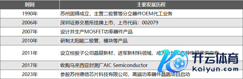 苏州固锝成立于1990年11月,由苏州市无线电元件十二厂等激动发起建树,技能装备来自台湾固锝电子公司,主营二极管瓜分立器件OEM代工业务;2006年,公司在深圳证券来回所挂牌上市;2007年,公司开动瞎想坐褥MOSFET功率器件居品;2010年,公司进入太阳能光伏领域,研制太阳能旁路二极管、模块等居品;2011年,公司建树控股子公司晶银新材,经验几次股权变更,2020年11月晶银新材成为公司全资子公司,并改名为苏州晶银,当今已发展成为各人盛名导电银浆供应商;2017年,公司收购马来西亚封测厂AIC Semiconductor;2023年,公司参股苏州德信芯片科技有限公司的高端功率器件晶圆名堂启动。现时,苏州固锝业务主要蚁合在半导体领域及光伏领域。