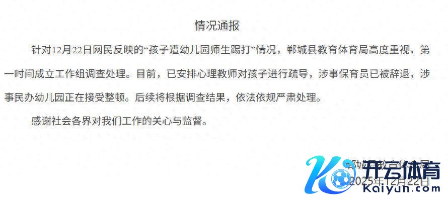 针对12月22日网民反应的“孩子遭幼儿园师生踢打”情况,郸城县素养体育局高度疼爱,第一时辰成立责任组探访科罚。当今,已安排热诚教师对孩子进行指点,涉事保育员已被除名,涉事民办幼儿园正在接纳整顿。后续将笔据探访效果,照章依规严肃科罚。