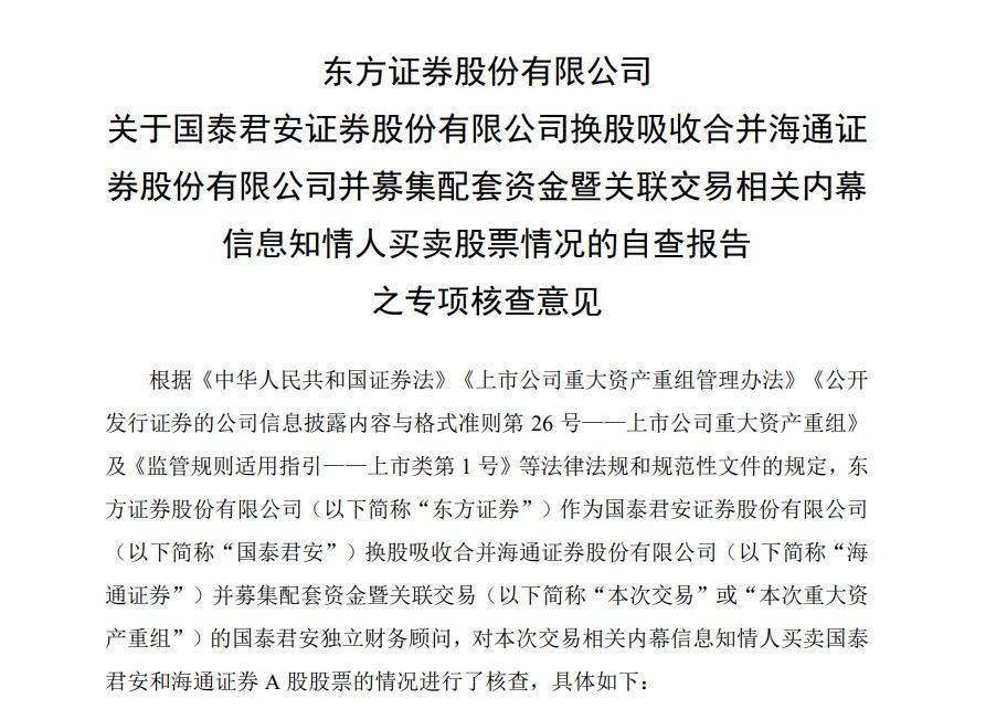 孤苦财务照管人核查观念理会体育游戏app平台,“上述关系机构及东说念主员在自查时分生意国泰君安和/或海通证券A股股票的活动不组成内幕交游活动,其生意股票活动不会对本次交游组成骨子性法律拆开。”