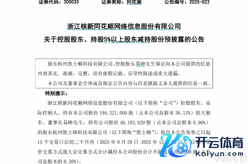 除了易峥以外,5日公告中透露的拟减握股东还有杭州凯士顺科技有限公司(简称“凯士顺”)拟减握部分公司股份。把柄公告,凯士顺当今握有公司股份4819.38万股,占总股本的8.96%,其拟减握不朝上69.91万股,占总股本的0.13%。把柄公告,凯士顺所握股份则着手于同花顺IPO前其所握股份,其减握目标主要为为本人资金需要。