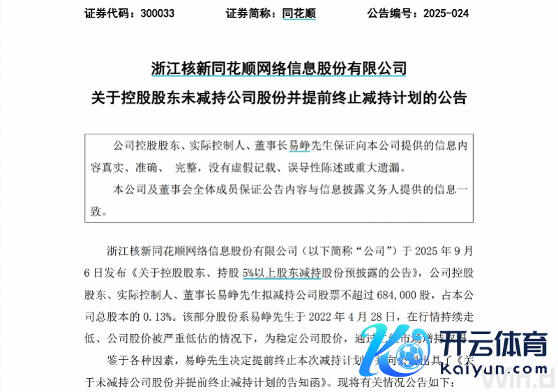 9月9日凌晨,在发布股东减握公告仅一个责任日后,再次公告称,鉴于各式要素,董事长易峥决定提前绝交本次减握方案。本次减握方案尚未试验。公司上市于今近16年,董事长易峥从未减握公司股份。